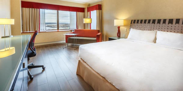 Installation à l’hôtel, situé tout près des chutes illuminées en soirée.